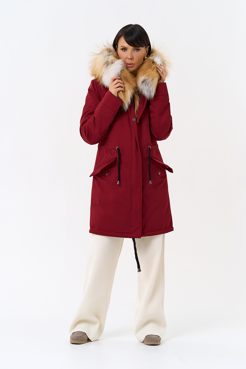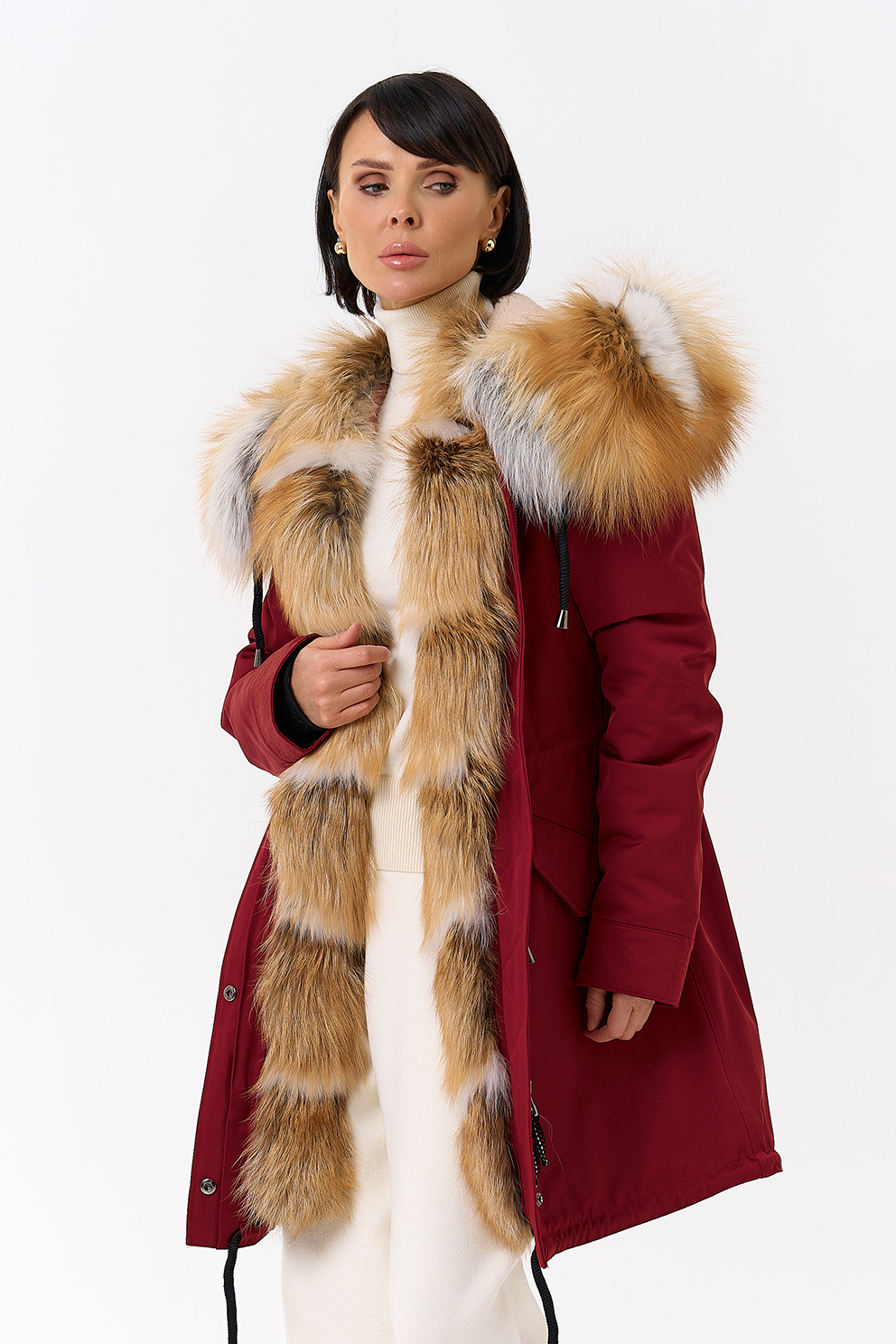 Крой воротника - капюшон, отделка лиса рыжая, овчина